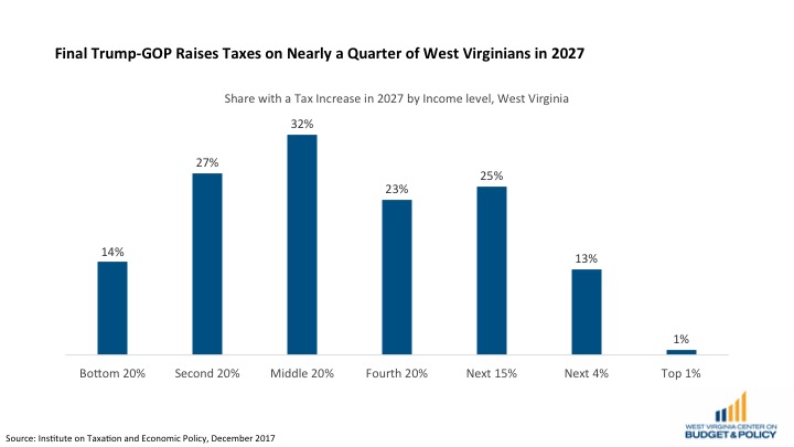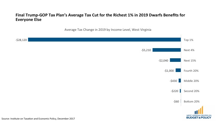 The richest one percent of West Virginians would enjoy an average tax cut of $18,830 in 2018, and this average tax cut would rise to $21,090 in 2027. The middle fifth of income-earners would receive an average tax cut of $450 in 2018, which would fall to $240 in 2027. Only the top one percent of West Virginians would see their tax cut grow over time, for everyone else, the size of the tax cuts shrinks by 2027.